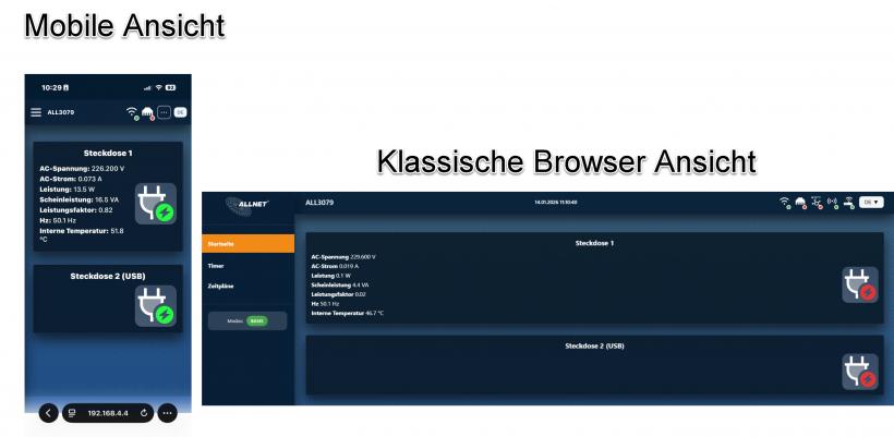 Geben Sie in die Adresszeile des Browsers folgende IP-Adresse ein: http://192.168.4.4 Nach kurzer Zeit wird die Weboberfläche (WebGUI) des Smart-Plugs angezeigt.